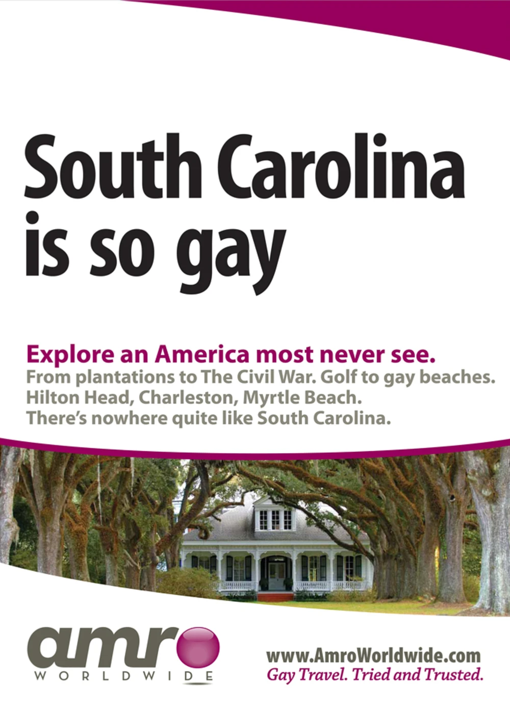 The campaign, launched by marketing agency Out Now Consulting, was intended to promote Amro Worldwide, a London-based gay tour operator, and to tout tourism to several gay-friendly U.S. destinations. In the week leading up to the British capital’s gay pride parade on July 5, the agency placed 60 posters along escalators in London’s Leicester Square and Covent Garden tube stations, which serve Soho, the city’s gay hub. The South Carolina poster features a generic image of a plantation, and hyped the state’s antebellum architecture, golf courses and gay beaches.
